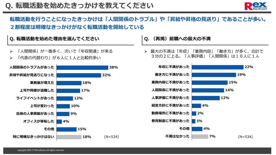 - 転職活動を行うことになったきっかけは「人間関係のトラブル」や「昇給や昇格の見送り」であることが多い。