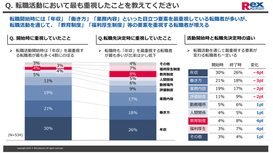 これが最終的に転職先を決める際には、年収が少し減って26%になり、働き方も少し減って18%、業務内容も少し減って17%と下がっています。代わりに教育制度や福利厚生制度が4ポイントも上昇しています。