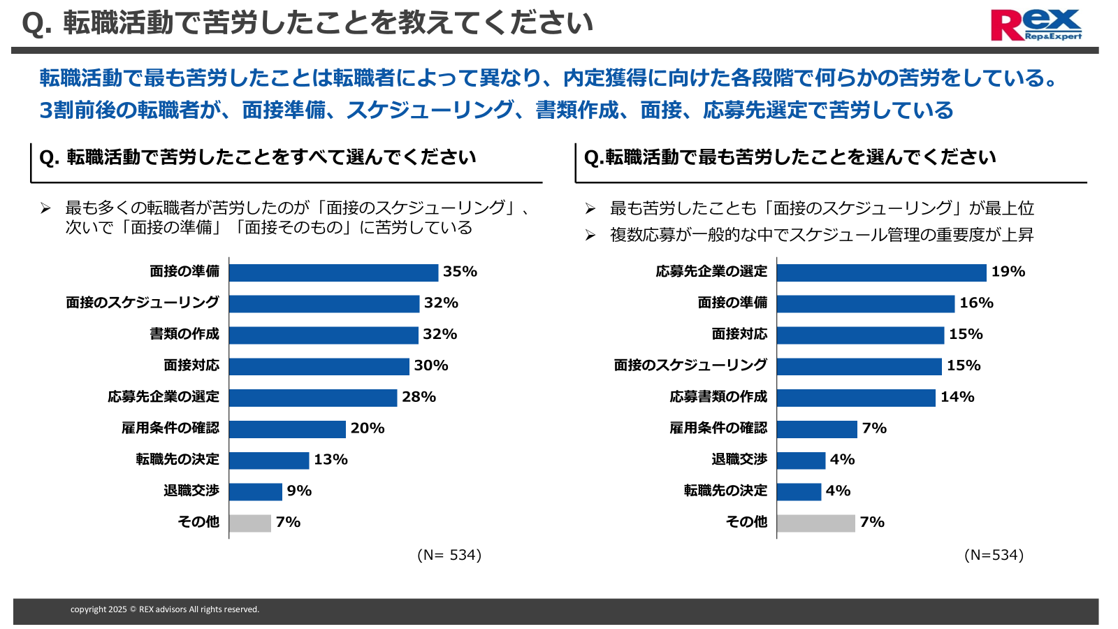 - 転職者の35%が「面接の準備」に苦労している。他にも、スケジューリング(32%)、書類作成(32%)、面接対応(30%)と書類提出から面接で苦労