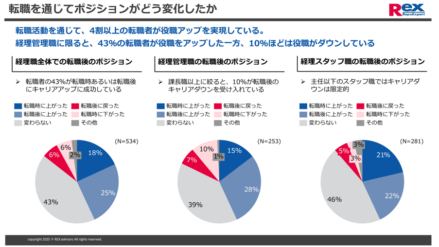 一方で、キャリアダウンを飲んで転職した方も全体の12%ほどいました。これは働き方の改善であったり、キャリアチェンジであったりによって、一時的なキャリアダウンを受け入れる方がいることを示しています。なおその半分は転職後に昇進し、元の役職やポジションに戻っています。